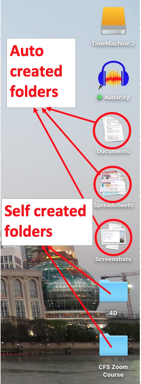Recently, whenever I saved any documents onto my mac desktop, if there's more than 2 documents of the same format (eg. Word or Excel) an "auto-generated" folder appears and all these documents will go into it. If the documents I saved on my desktop are MS Word fomat, they go into a "Document" auto-generated folder, if MS Excel formal they go into a "Spreadsheets" auto-generated folder. Even when I take multiple screenshots, the captured shots go into an auto-generated "Screenshots" folder. Why is this so ??? I do NOT need an auto folder generated for me to save whatever documents I have. I can create my own folder to group all my documents more appropriately. This weird auto-generated folder thingy just happened recently. It wasn't like that before. Now I have to go thru all my documents to re-group them in the proper self-created folders that I want. Its driving me nuts !