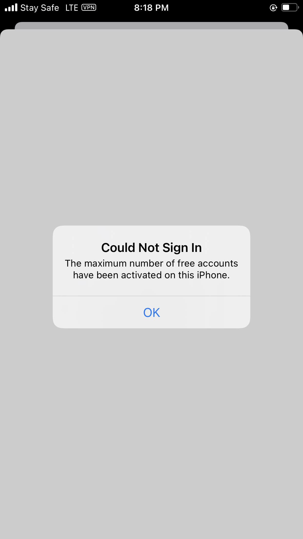 The maximum number of free accounts have been activated on this iPhone. Then it tell me to press ok………….after I press okay it Will tell me could not sing in.