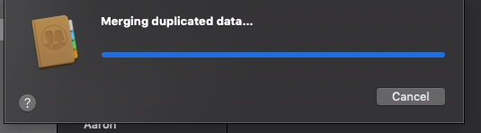I have a ridiculous amount of duplicate contacts on my mac, something like 2000 duplicate entries. I am trying to remove them. They only appear in Mac contacts, not iCloud. In the contacts app I go to Card > Look for Duplicates > Merge contacts. Then the progress bar says "Merging duplicated data..." And lags out. I have force quit and tried again, same issue. I can't even cancel the operation. Force quit doesn't say that the app isn'e responding. The progress bar just stays for hours.