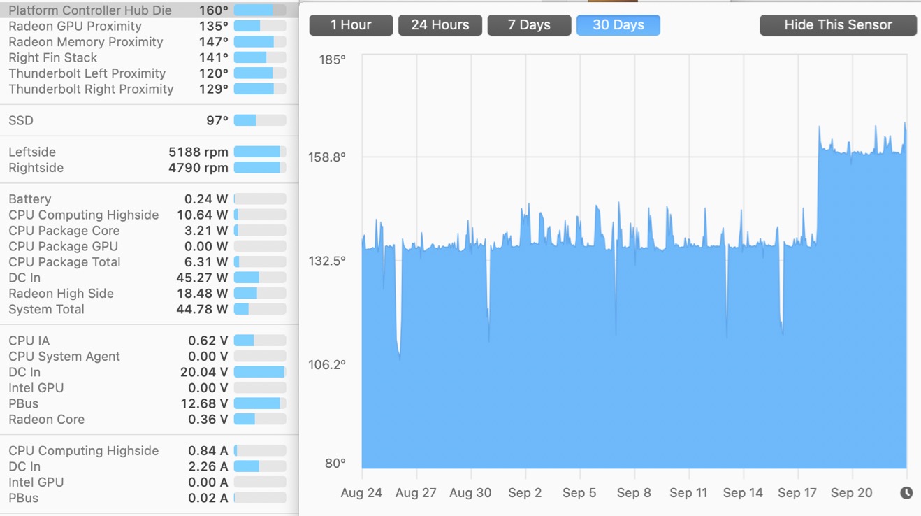 My MacBook Pro 16" fan has been running more than usually. I check iStat Menu Temps and find that my Platform Controller Hub Die Temp is 160.° I checked 30 day history and from Aug 22 to Sept 18 temp averaged about 135°. From Sept 18 to present Temp is averaging 155°.