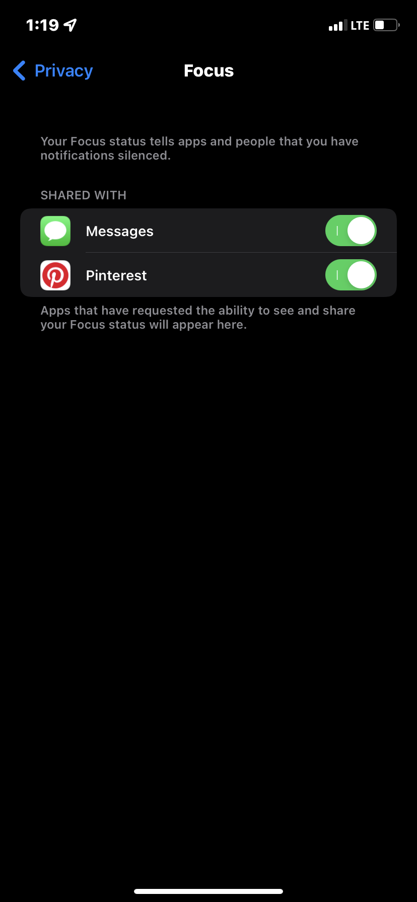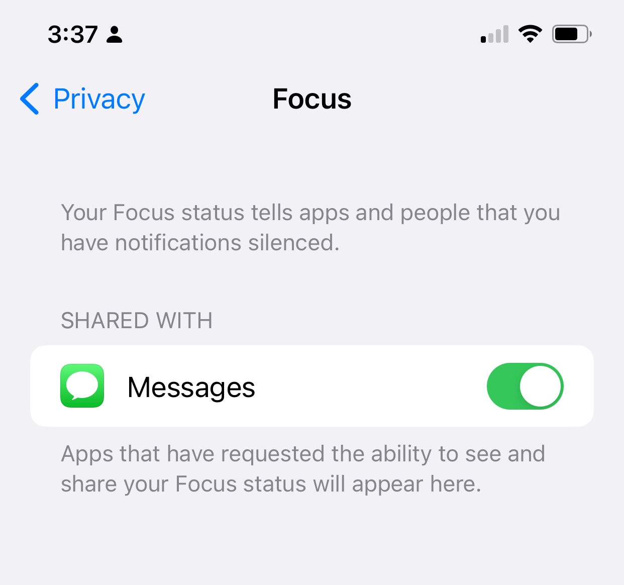 I have recently downloaded iOS 15 and my focus share status is not showing but other people who have iOS 15 that I am messaging, I can see their updated focus status at the bottom of our chat.