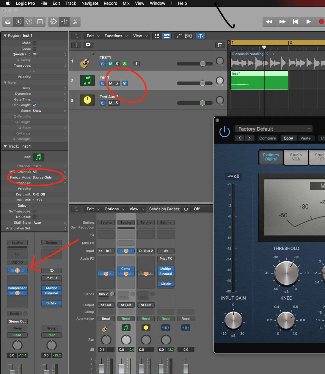 • Set the Freeze Mode to "Source Only". In the example below it is a soft inst that has a MIDI region.