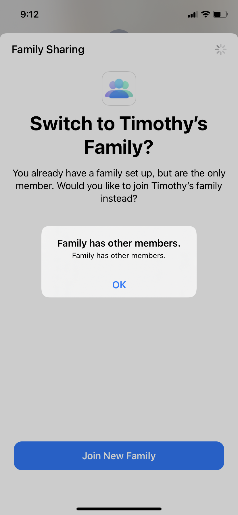 Thanks for reaching out to the Apple Support Communities! It sounds like you are havign issues joining someone else's family sharing group due to an error that your family has other members. First, let;s be sure you have followed these steps to Leave Family Sharing and disband your group: