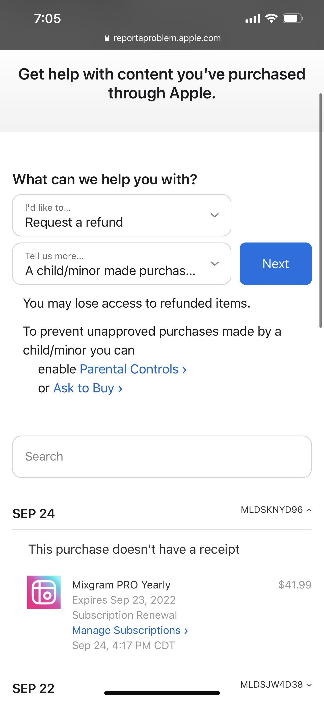 I’m trying to get a refund on an app subscription that was an accident and when I click on the purchase at the refund section it says no Receipt with purchase and won’t allow me a refund. But shows coming out of my bank acc and shows in the refund option place too. HELP!