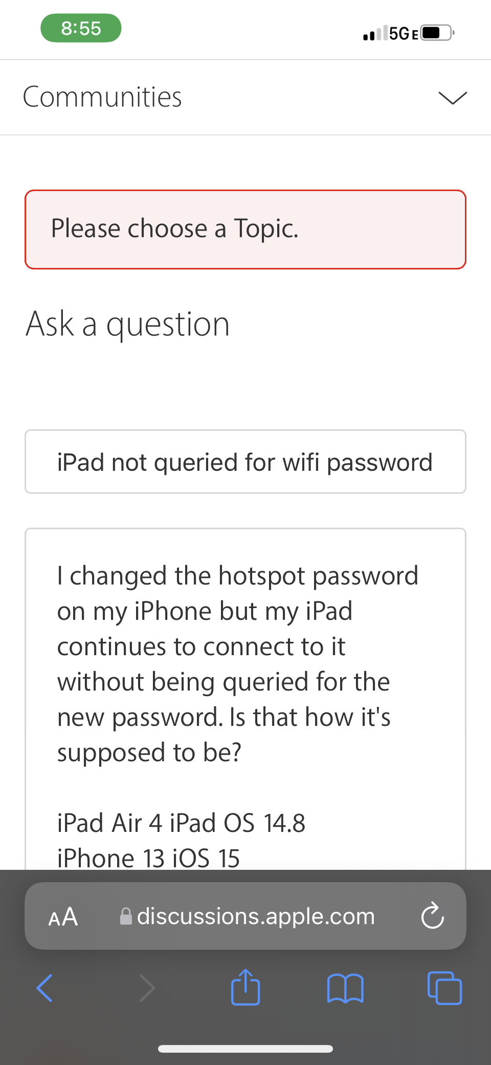 "Choose Topic?: When I tried to submit a question the forum asked me to choose a topic but tapping the pink box did nothing. Forum broken? See screenshot."
