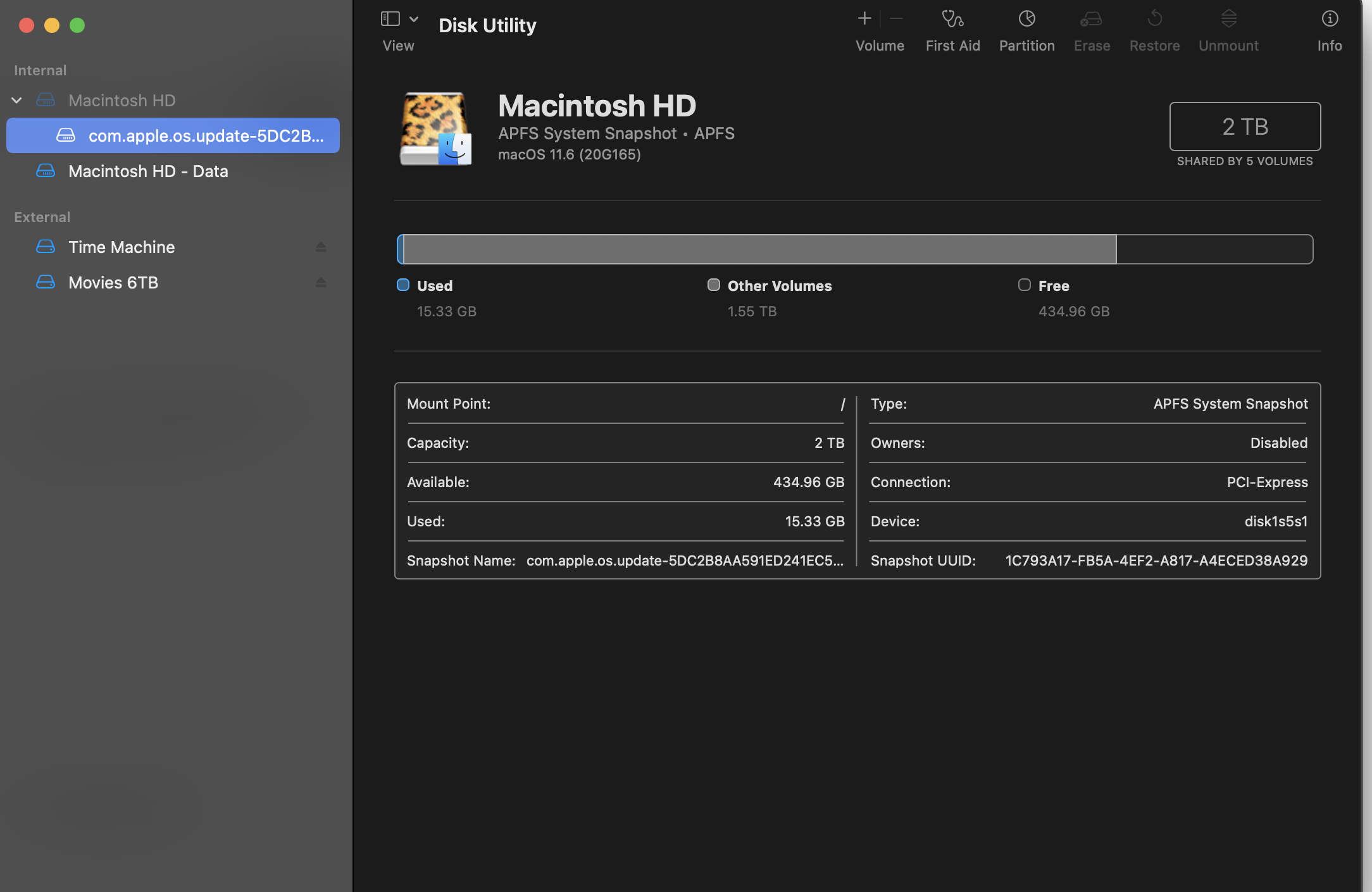 Big Sur uses a “snapshot” of the current system for its (SSV) Signed System Volume, as you see in the list. This is the new normal as well. This would be the 'Macintosh HD'