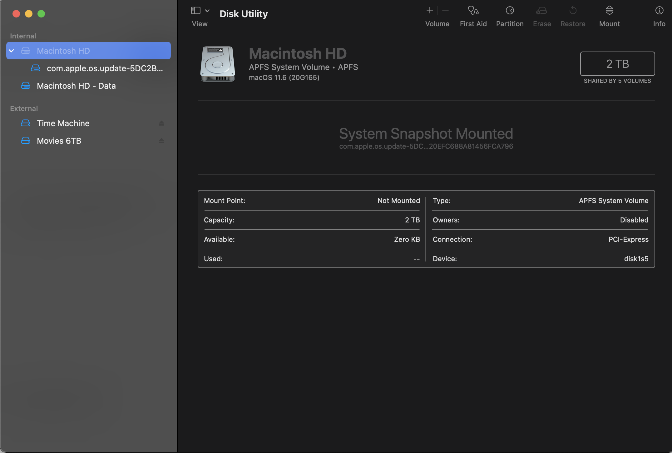Big Sur uses a “snapshot” of the current system for its (SSV) Signed System Volume, as you see in the list. This is the new normal as well. This would be the 'Macintosh HD'