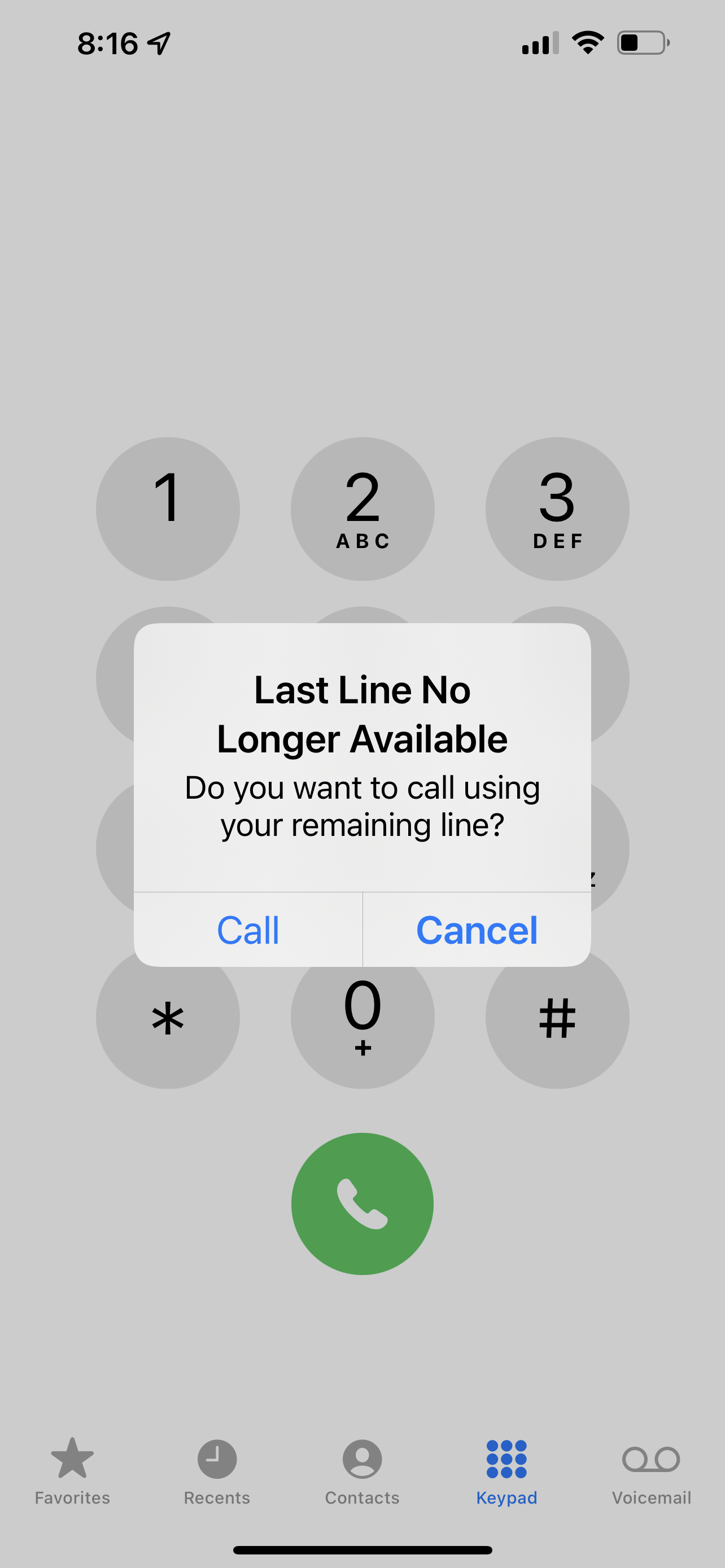 I keep getting a “Last line No Longer Available Do you want to call using your remaining line?” message when I try to call someone. It doesn’t matter if I go into my contacts to make the call or if I try to make a call from recent. I’ve had the iPhone 13 pro max for about 2 weeks and never had this happen. I have the brand new SIM card that came in the new phone. I didn’t use the SIM card from the 11 pro. Why is this happening?