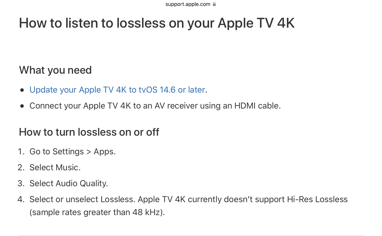 I am using the Lightning Digital AV Adapter (model A-1438) to connect Apple Music to my home hifi system. I plug my iPhone/iPod Touch into the HDMI input of the main amplifier by this adapter and the sound plays in the loudspeakers. However, I don't know if when I choose to stream Hi-Res audio (48b/192kHz) if it is transferred in this quality by the A-1438 adapter further to the amplifier? Does this Lightning Digital AV Adaptor supports Hi-Res audio? HDMI signal does support 48k/192kHz PCM in principle. This is the way, how to listen the Hi-Res music by the home high-end sound system.