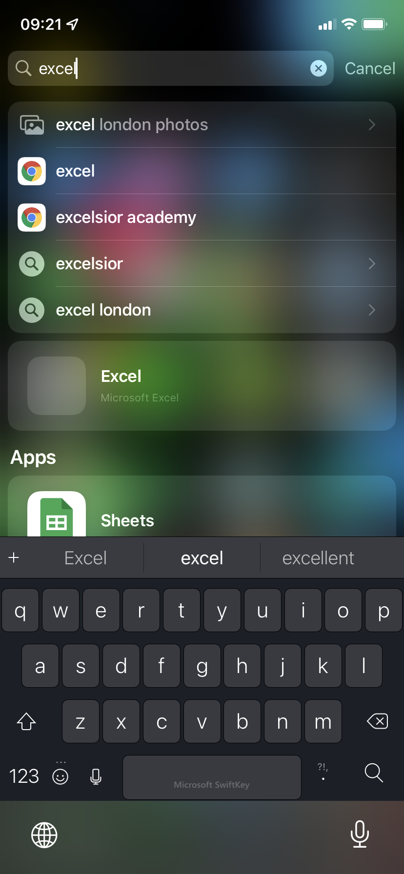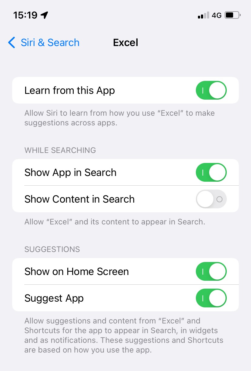 I've recently updated to iOS 15 and some apps aren't showing correctly in Spotlight Search. For example, when I search for "Excel", it shows in the Apps list but the icon isn't showing (see screenshot) and nothing happens when I click on it.