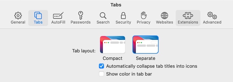 Hi, I'm still getting used to Safari 15 on macOS Big Sur. In general, I like the concept of combining the tab bar and the URL address bar via the "Compact" tab layout. But I do not like the "show color in tab bar" option, so I've disabled that.