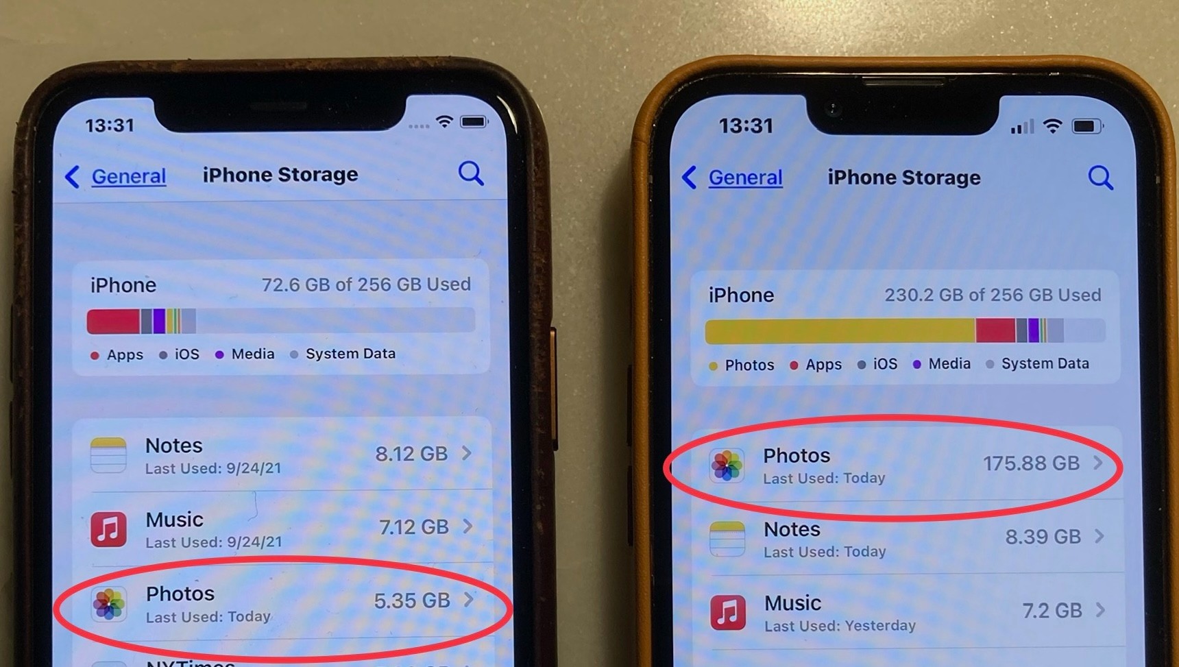 After I transferred all the data from my old iPhone11 Pro 256 GB (iOS15) to iPhone13 Pro 256 GB side by side, "Photos" have used up most of the storage space on the new iPhone.