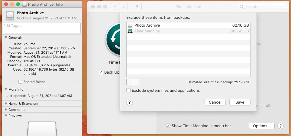 Notice that my Photo Archive which is formatted "Mac OS Extended (Journaled)" can be removed from the "Exclude...." list and backed up by Time Machine.