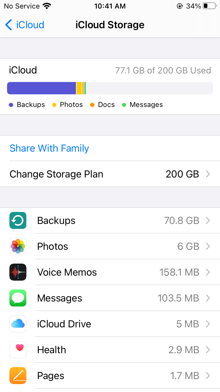 Next, your screenshot shows 70.8 GB of iCloud backups. That's a lot—my iPhone backup only takes 1.6 GB. Is this only for your iPhone, or do you have other Apple devices sharing the same iCloud account?