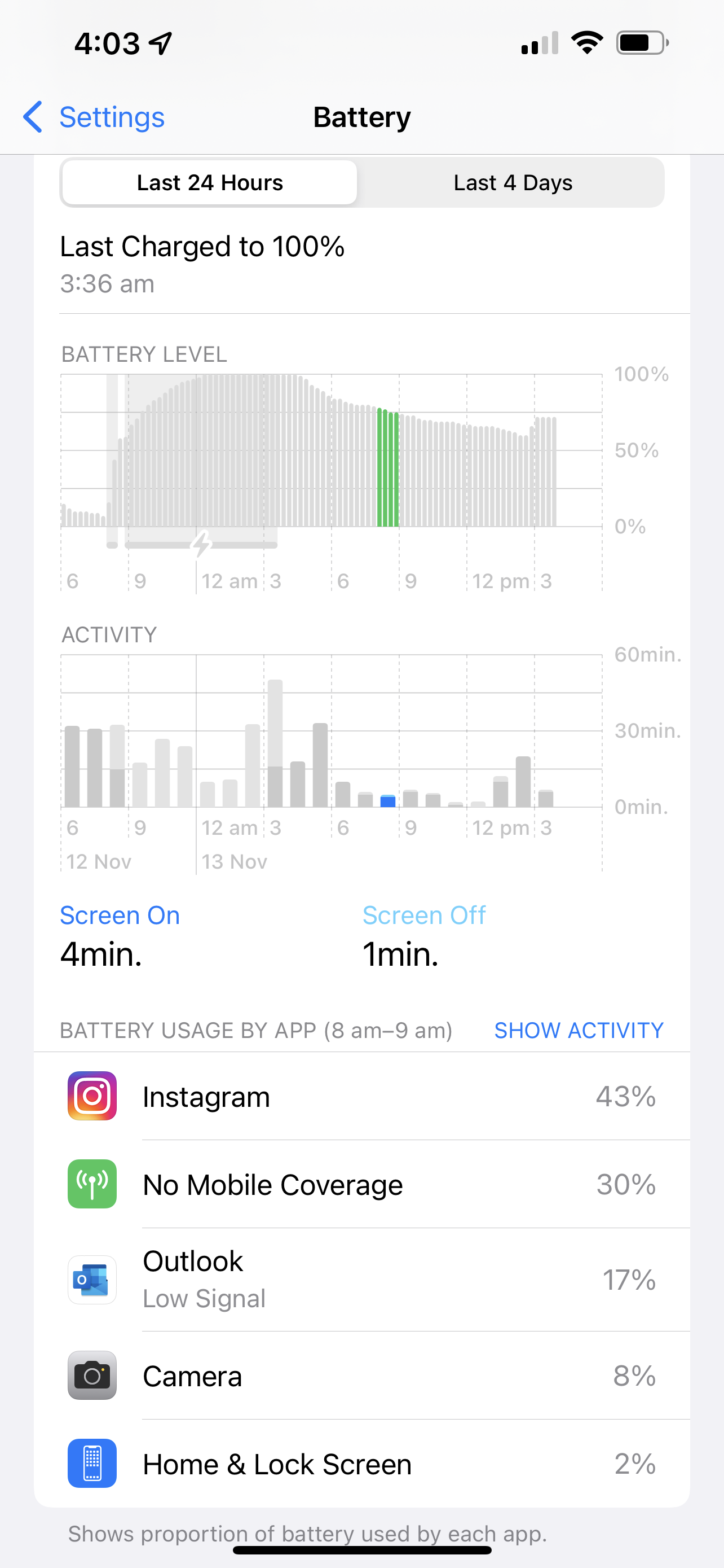 I went out to open sea fishing at 5am, came back at 1pm and my iPhone 13 Pro max only had 60% remaining. 😦 This got me wonder and worried as the total screen on time was only 90mins during these few hours out in the sea.