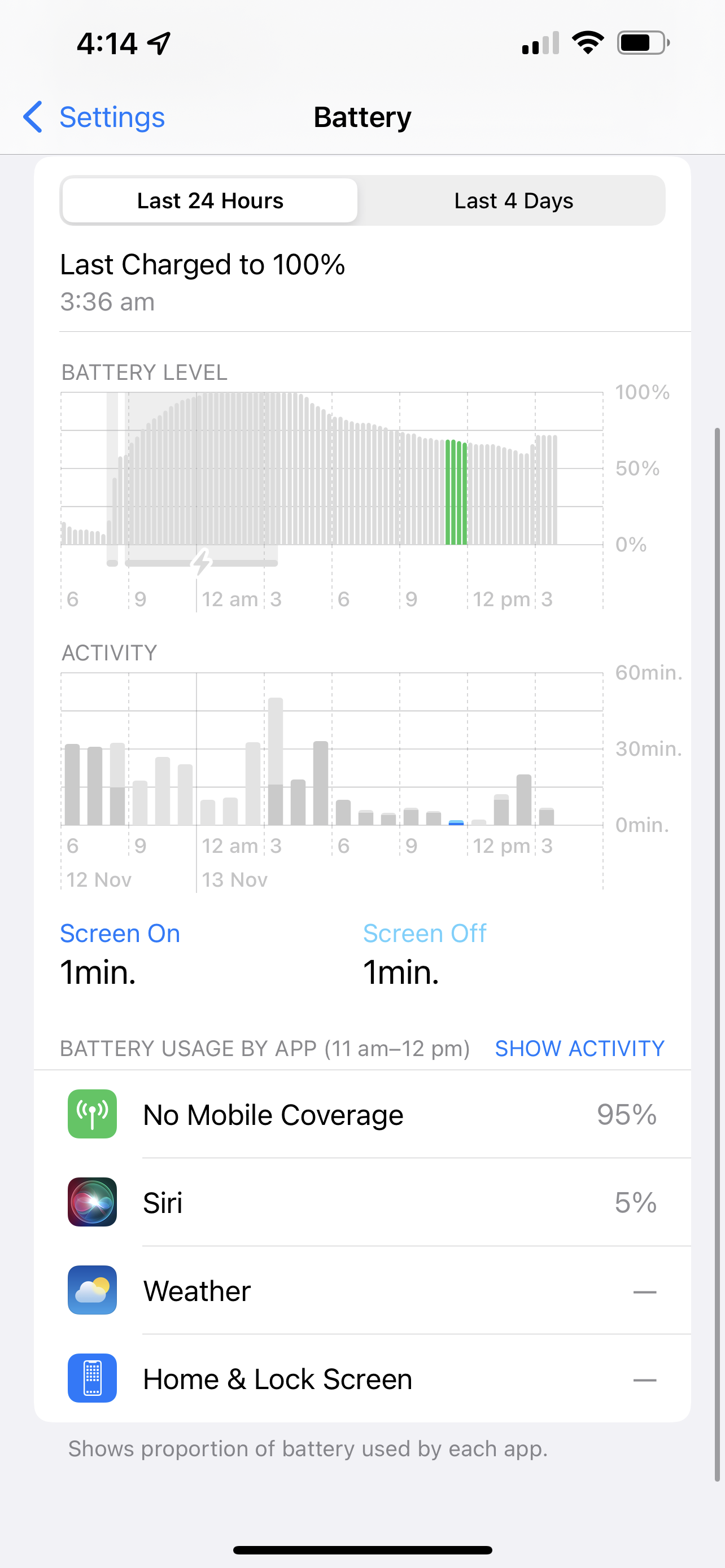 In the following screenshots, it shows that even though I only had 4 min screen-on time, 30% of the battery usage was used for “no mobile coverage”. The second screen shot further proves that 95% of the battery was used on “No mobile coverage” while I was further out in the sea.