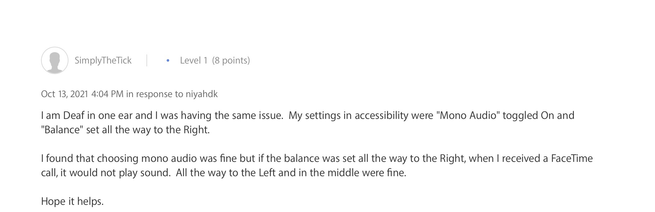 I found that choosing mono audio was fine but if the balance was set all the way to the Right, when I received a FaceTime call, it would not play sound. All the way to the Left and in the middle were fine.