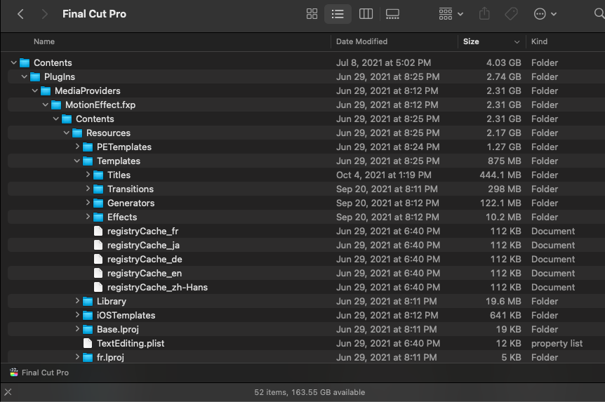 1) Why are my Titles, Transitions, Generators, Effects loading/coming from the Application -> Final Cut Pro -> Show Package Contents section instead of a folder by itself located somewhere else (even after I created a Motion Templates folder and named the files for example titles.localized and so on...