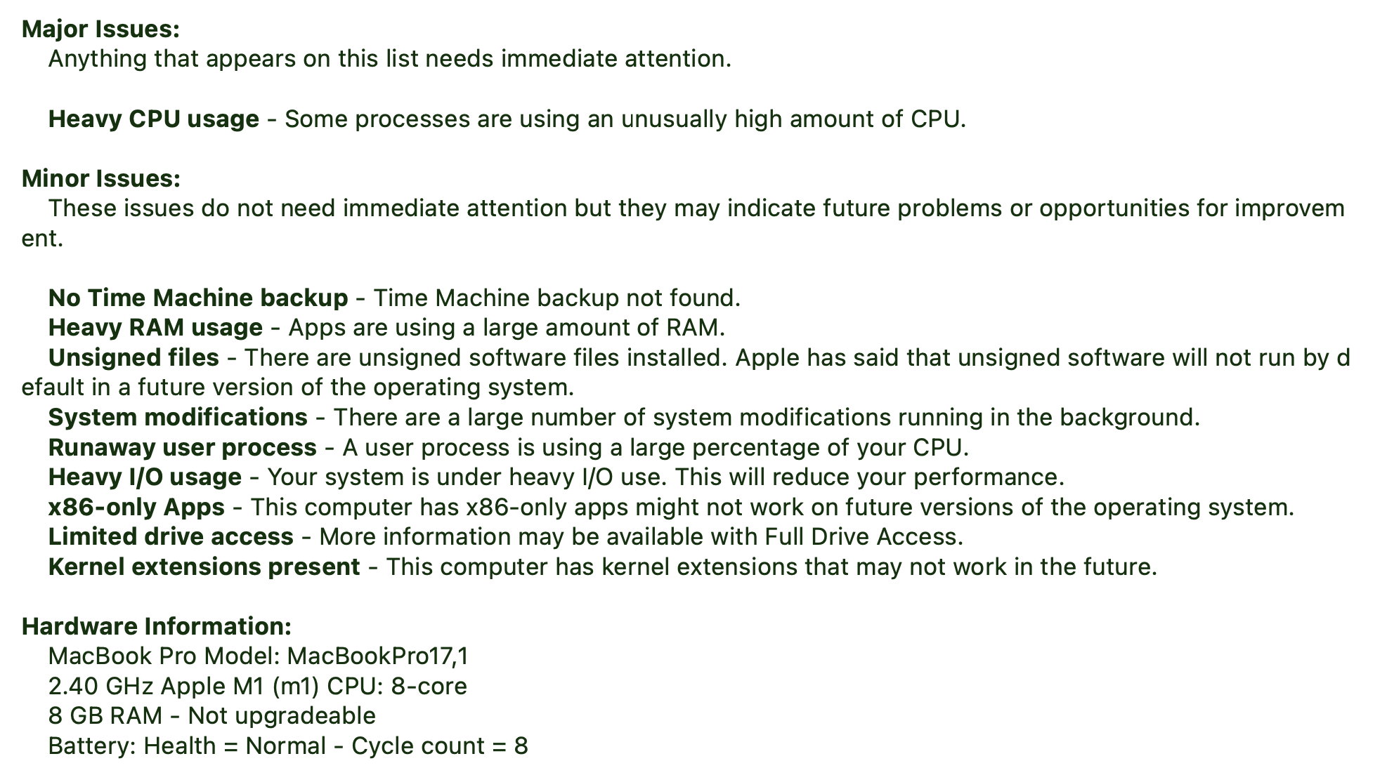 When I load a website or app on my old mac and new mac at the same time, my old mac beats it. I did an EtreCheckPro Report, it is attached. It looks like the major issue is Heavy CPU Usage. Can I fix this on my own or do I need to bring it into the Apple Store? Thanks for help!