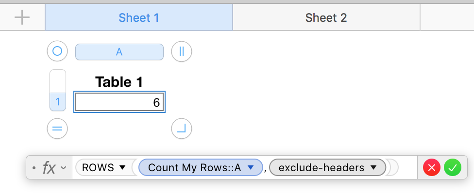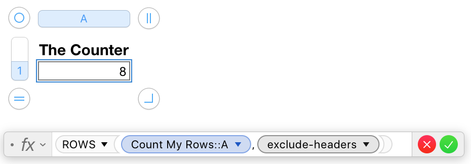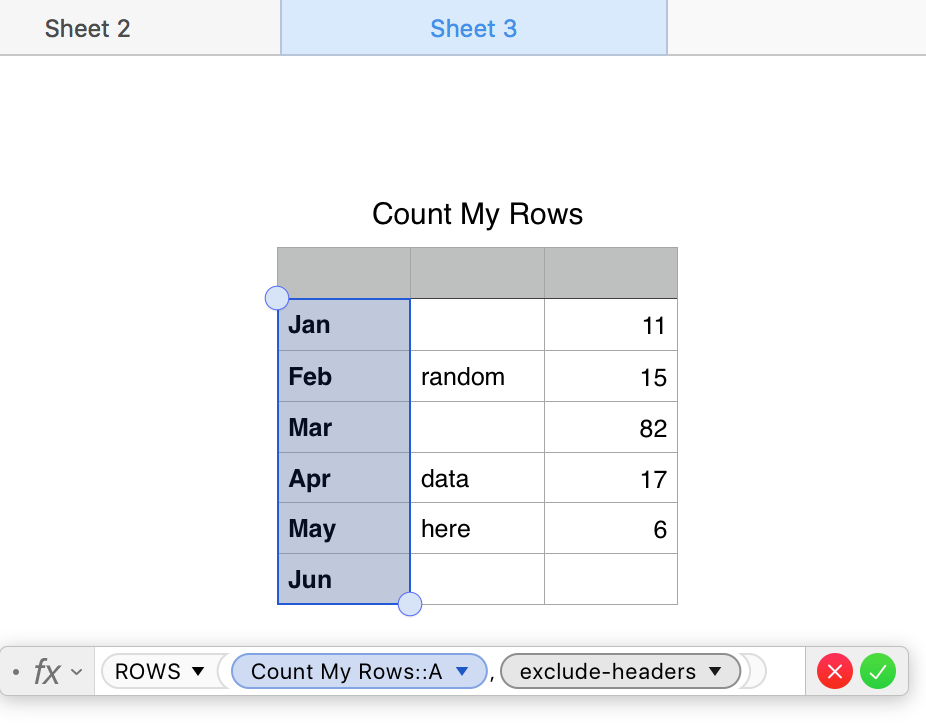 - Count My Rows has a Header row and initially 6, now 8 body rows. The second argument of ROWS can be set to include the Header row(s) or, as it is here, to ignore them when doing the count.
