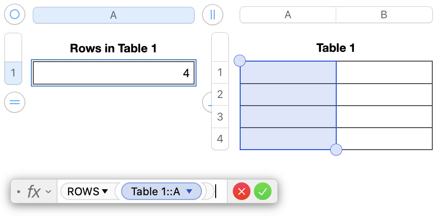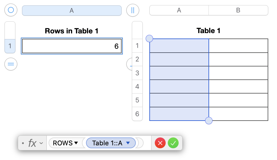 Formula in the single cell table on the left: ROWS(Table 1::A)