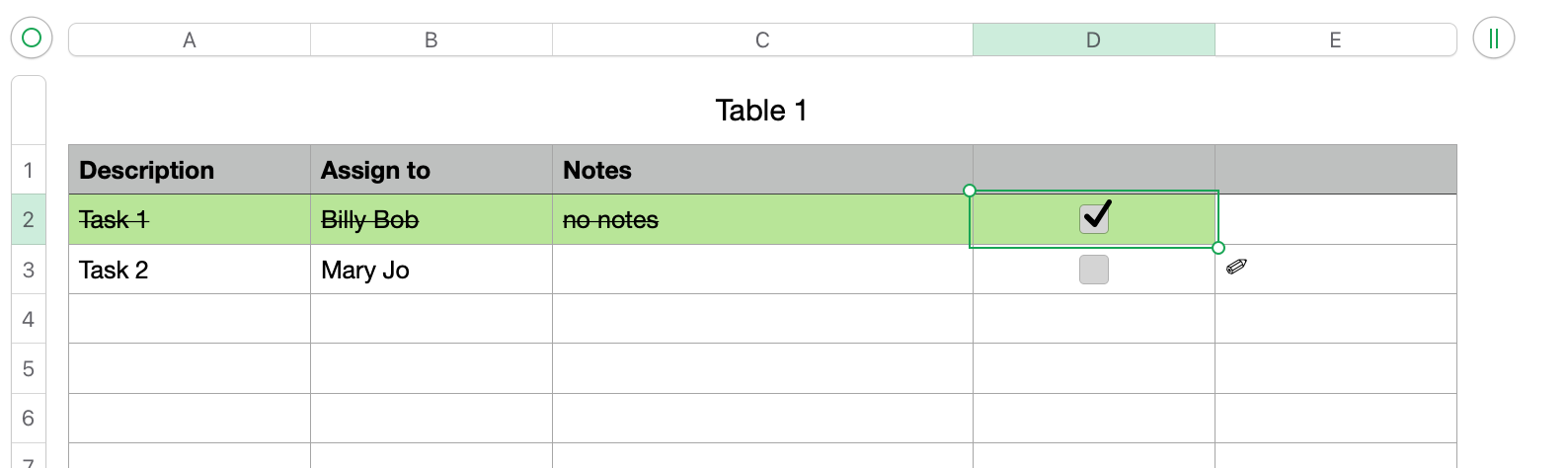 Here's an example. "My Tasks" is the table whose rows are to be highlighted when the checkbox cell in column A of that row is checked, indicating the task(s) have been completed.