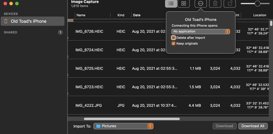 Apparently, I must have had a "brain fart". This problem was self-imposed, I had an old cell phone attached that I use only for a game that is on it. Mac Os did not identify it as a device in Image Capture but did recognize it as a device. A bit confusing needless to say. In the future, if this type of problem shows up, the first step should be to disconnect all external devices and then reboot. If the problem does not turn up, you are good,