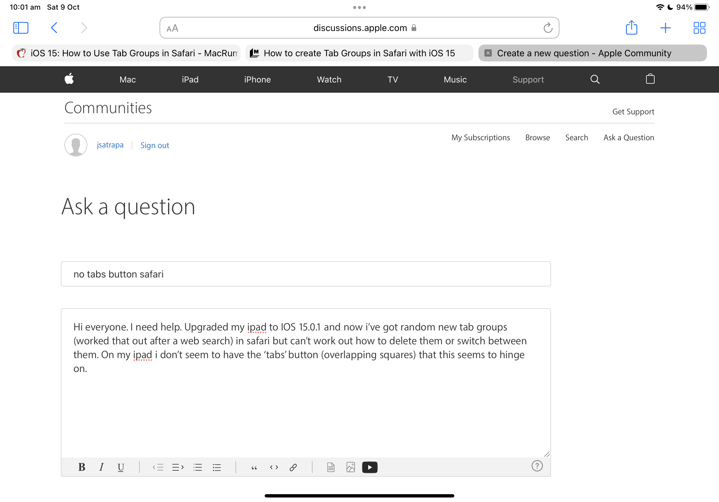 Hi everyone. I need help. Upgraded my ipad to IOS 15.0.1 and now i’ve got random new tab groups (worked that out after a web search) in safari but can’t work out how to delete them or switch between them. On my ipad i don’t seem to have the ‘tabs’ button (overlapping squares) that this seems to hinge on.