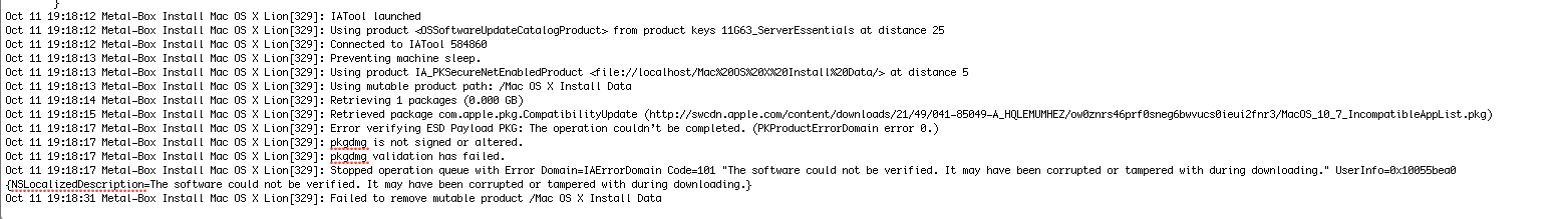 Oct 11 19:18:17 Metal-Box Install Mac OS X Lion[329]: Stopped operation queue with Error Domain=IAErrorDomain Code=101 "The software could not be verified. It may have been corrupted or tampered with during downloading." UserInfo=0x10055bea0 {NSLocalizedDescription=The software could not be verified. It may have been corrupted or tampered with during downloading.}