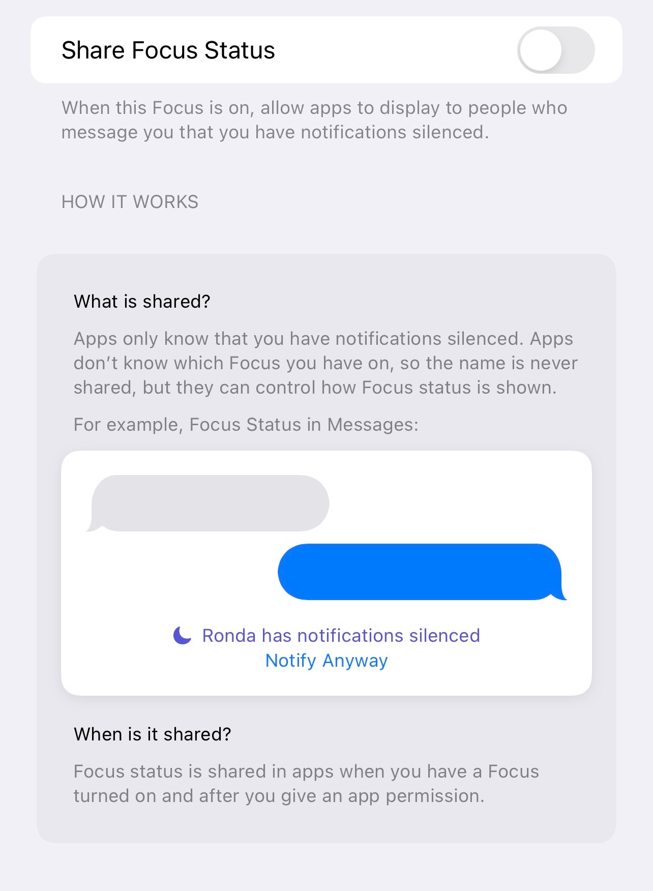 I’ve been texting with a good friend of mine and all of a sudden at the very bottom of our texting thread it says “🌙 Molly has notifications silenced “. What does this mean? Is she specifically silencing my specific text messages so she doesn’t receive them or the banner doesn’t pop up? She has an iPhone as well and I’ve never seen this message before. My feelings are a bit hurt but I’m not really sure what it means, if someone could explain this to me I would so appreciate it.