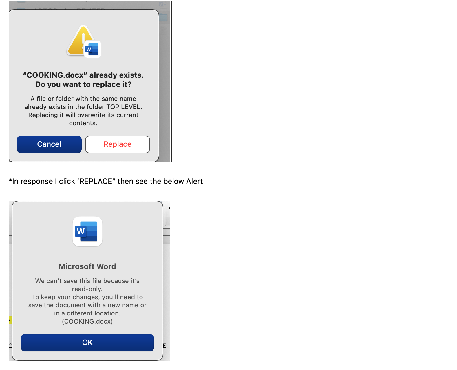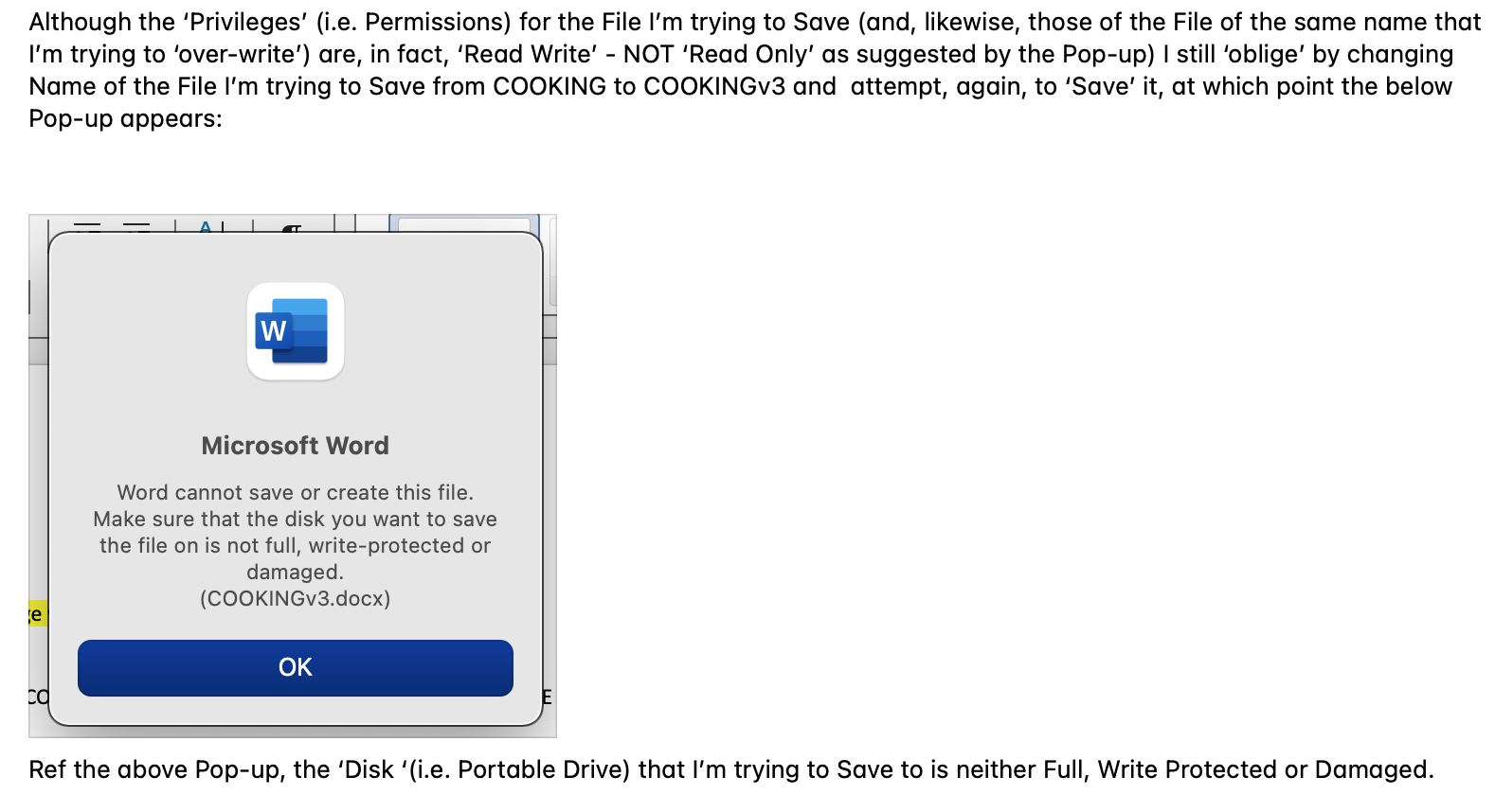 My issue is that, if (after saving the file on my Mac) I then try to save it back to it's original Folder on my Portable USB Drive (by using MS Word’s 'Save As’ option), I get a Pop-up from Microsoft Word telling me it can't 'over-write' the file's 'earlier version' on the USB Drive. This seems to be because Microsoft Word appears to believe that either: