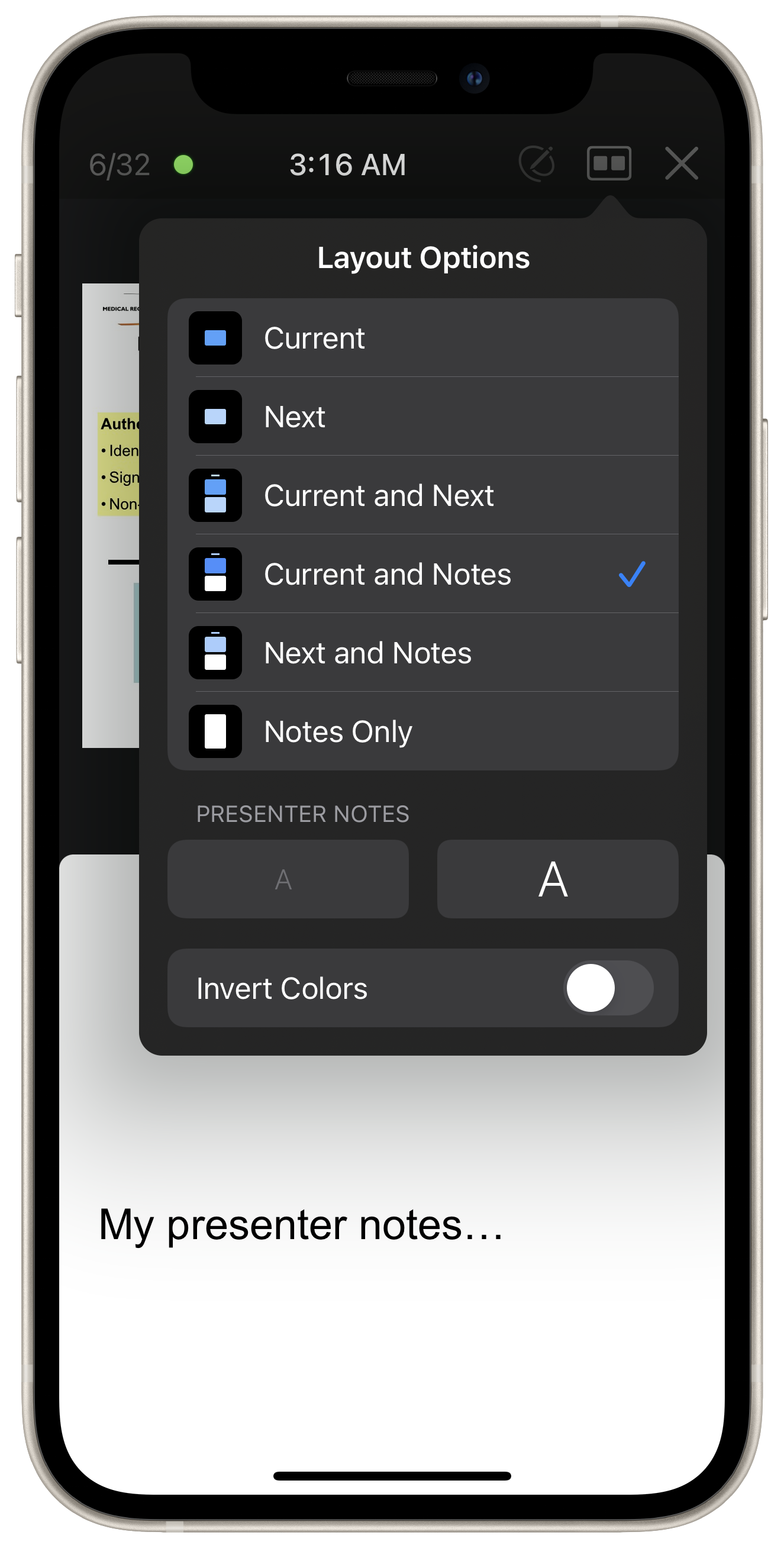 Start the Keynote Live presentation on the linked device, then join with Keynote Remote on your iPhone. Tap Play on your iPhone, then tap the Layout button and select an option.