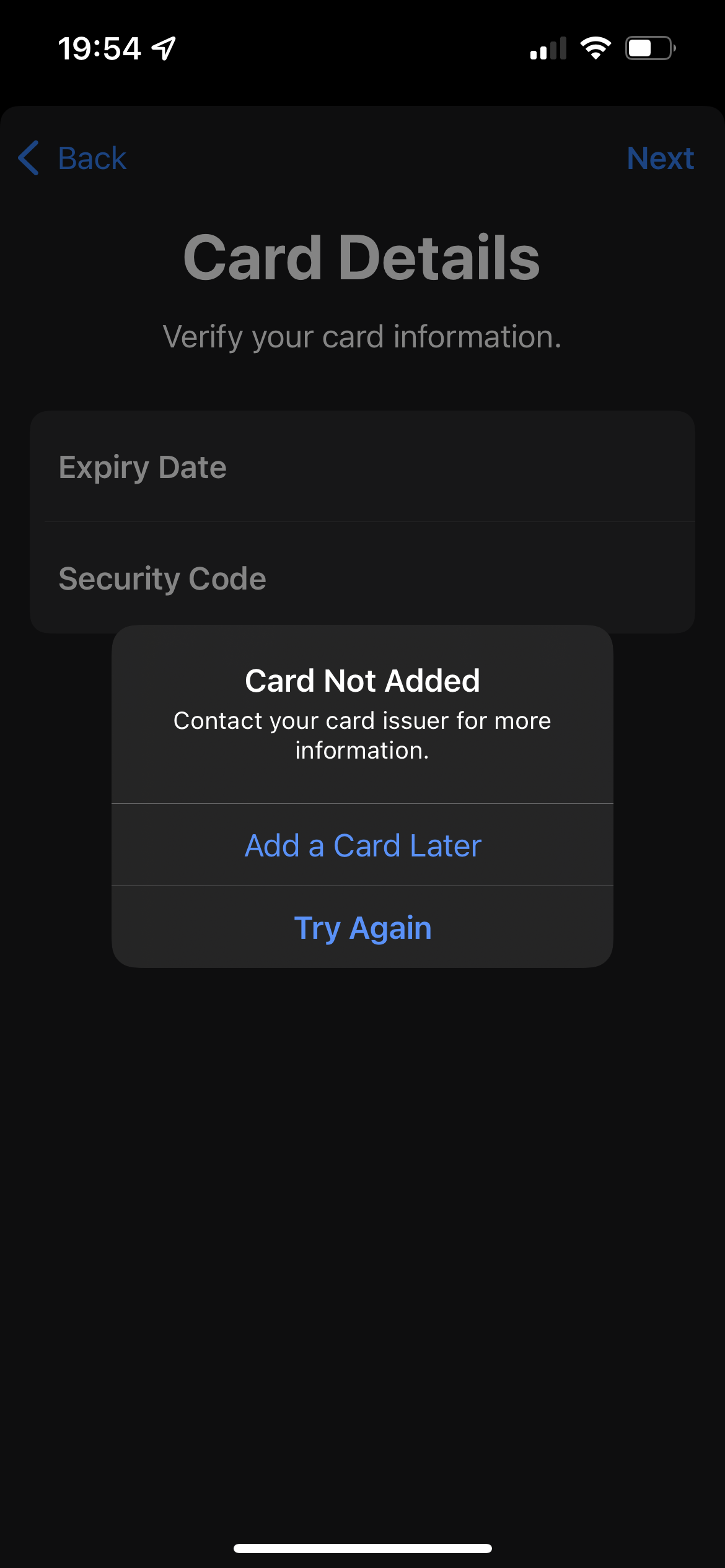 Hey, i just bought The new iPhone 13 And i can’t add my card to ApplePay. I Use to use it on my previous phone And everything worked well. I tried everything What i could only find on The ethernet And Nothing worked. Any suggestions?