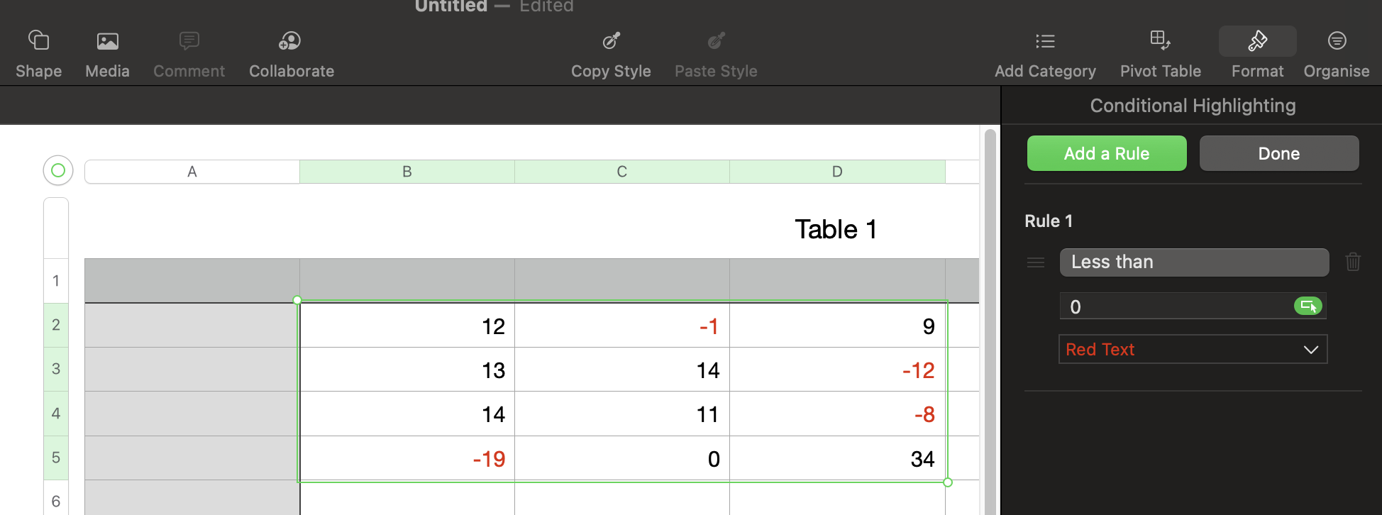 Select the cells you want the change to apply to. Click Format in the Inspector, then Cell, then click Conditional Highlighting.