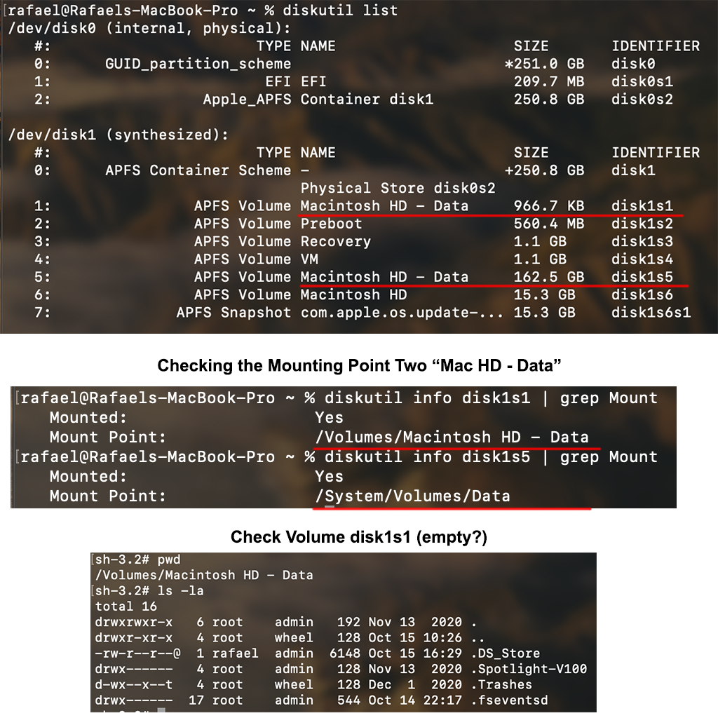 Another doubt, the volumes disk1s6s1 (mounted at / ) and disk1s5 (mounted at /Systems/Volume/Data) seems the same directory. But I dont found any symlink appointed to other, except home folder (/home -> /System/Volumes/Data/home).