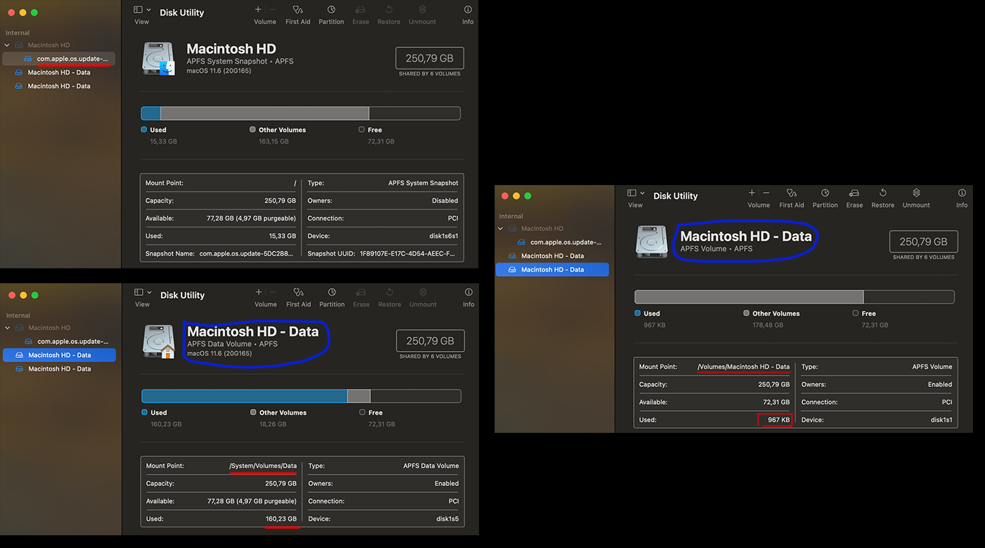 Another doubt, the volumes disk1s6s1 (mounted at / ) and disk1s5 (mounted at /Systems/Volume/Data) seems the same directory. But I dont found any symlink appointed to other, except home folder (/home -> /System/Volumes/Data/home).