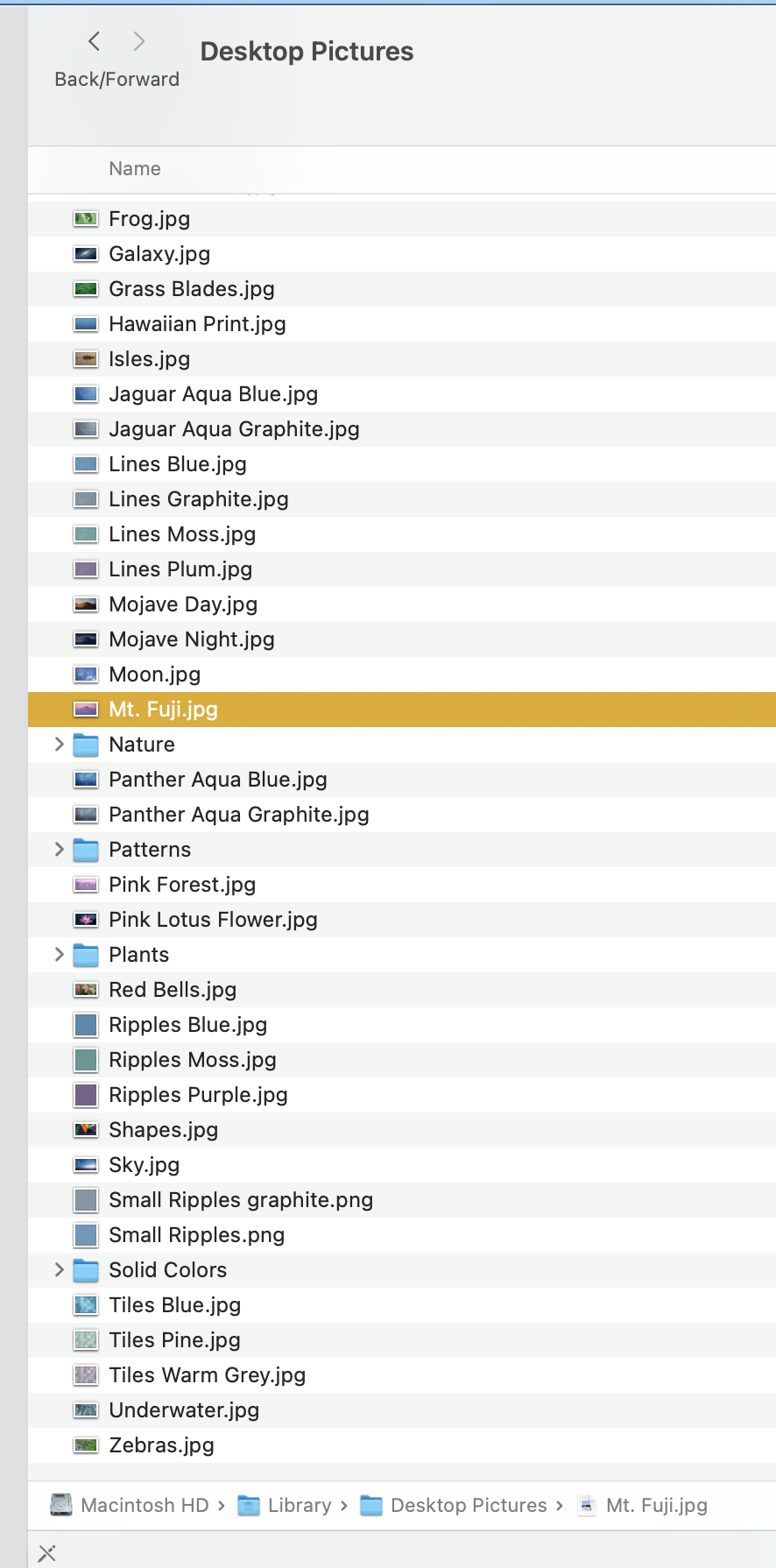 The high-resolution Mt Fuji image is among those provided in macOS Big Sur. Open the Desktop & Screen Saver preference panel and under the Desktop tab, select Apple Desktop Pictures. Scroll to locate the Mt. Fuji image.