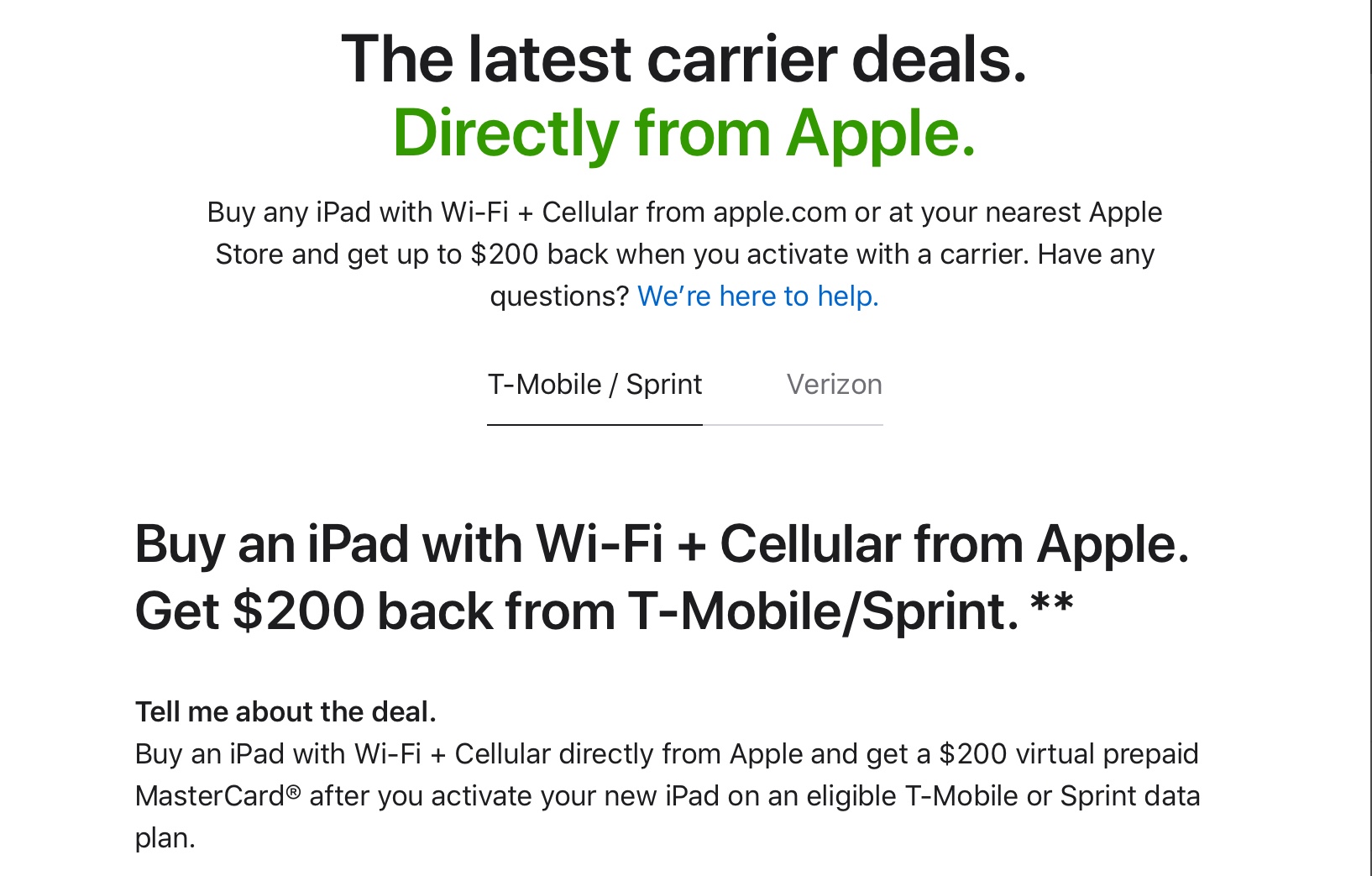 The promo states: “Buy an iPad with Wi-Fi + Cellular directly from Apple and get a $200 VIRTUAL prepaid MASTERCARD after you activate your new iPad on an eligible T-Mobile or Sprint data plan.” It goes on to say, “Within 90 days of placing your order, activate an eligible 10GB or larger data plan with T-Mobile/Sprint and complete the promotion redemption at promotions.t-mobile.com….You’ll receive an email with the next steps after you buy your iPad. Once you’ve completed all steps and your eligibility has been processed, you’ll receive a $200 virtual prepaid MasterCard gift card within six to eight weeks.”