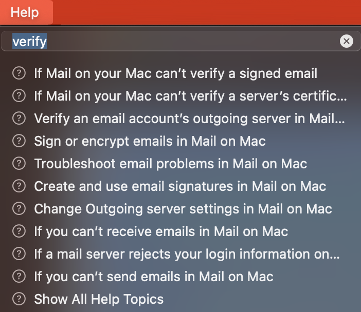 Thanks again. When I went into Mail and typed "verify" into the search bar, I did not get the screen that was on your reply - I just got a few emails that I suppose had the word "verify" in them. I also tried clicking on "Help" in Mail and typing the word 'verify' in the search bar ... no luck.