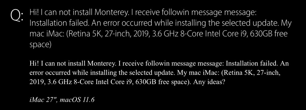 Hi! I can not install Monterey. I receive followin message message: Installation failed. An error occurred while installing the selected update. My mac iMac: (Retina 5K, 27-inch, 2019, 3.6 GHz 8-Core Intel Core i9, 630GB free space)