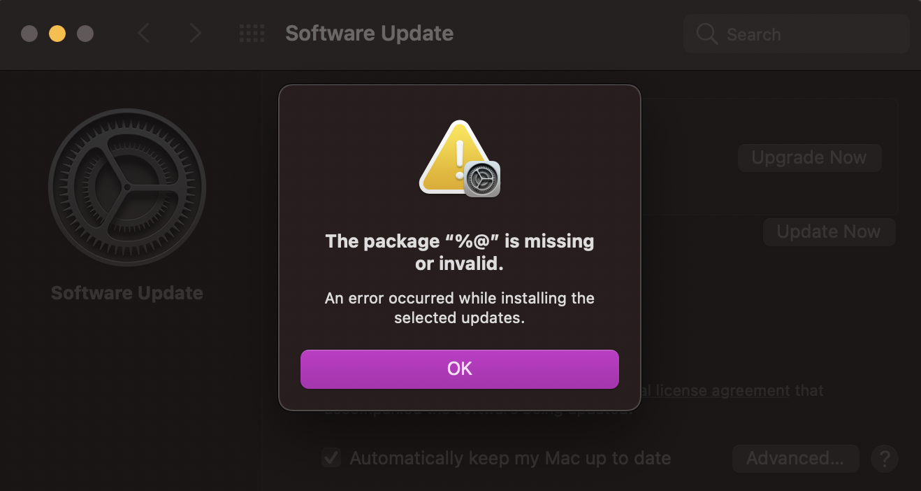 I have a new M1 iMac 24" and tried to install the Monterey update today and after the download completed I got the following error: The package "%@" is missing or invalid