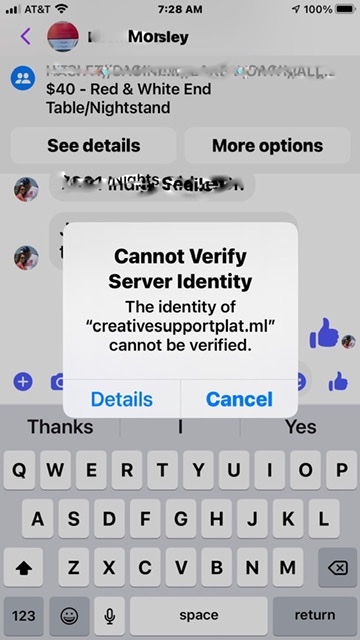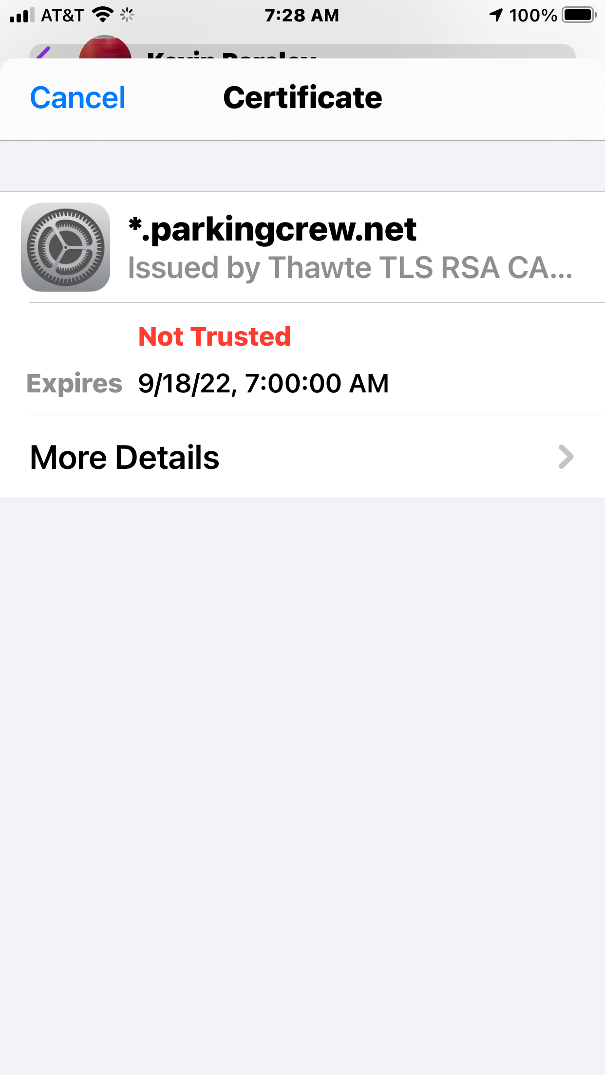”Cannot verify server Identity- The identity of creativesupportplat.ml cannont be verified” and clicking details shows *.parkingcrew.net’s digital certificate cannot be trusted.