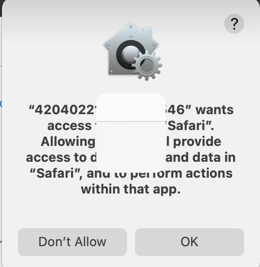 This keeps popping up on my screen. I tried looking for "420402216190876546" in finder and spotlight search but it doesn't show up for anything. I have been pressing "Don't Allow" because I don't want to mess anything up. But this keeps popping up every 2 min or so and it is getting really annoying. This little box that has nothing in it always pops up with it and disappears with it too. Here is the screenshot.