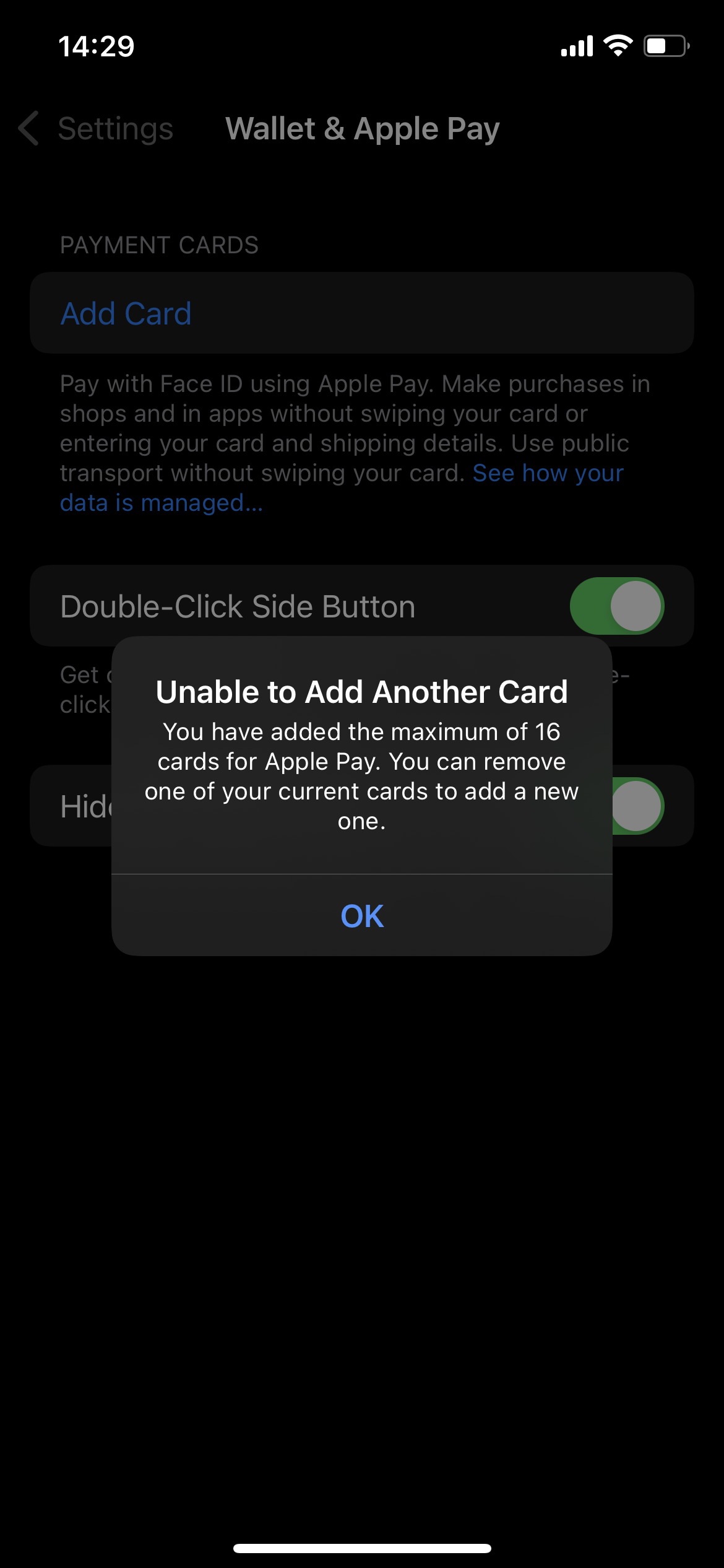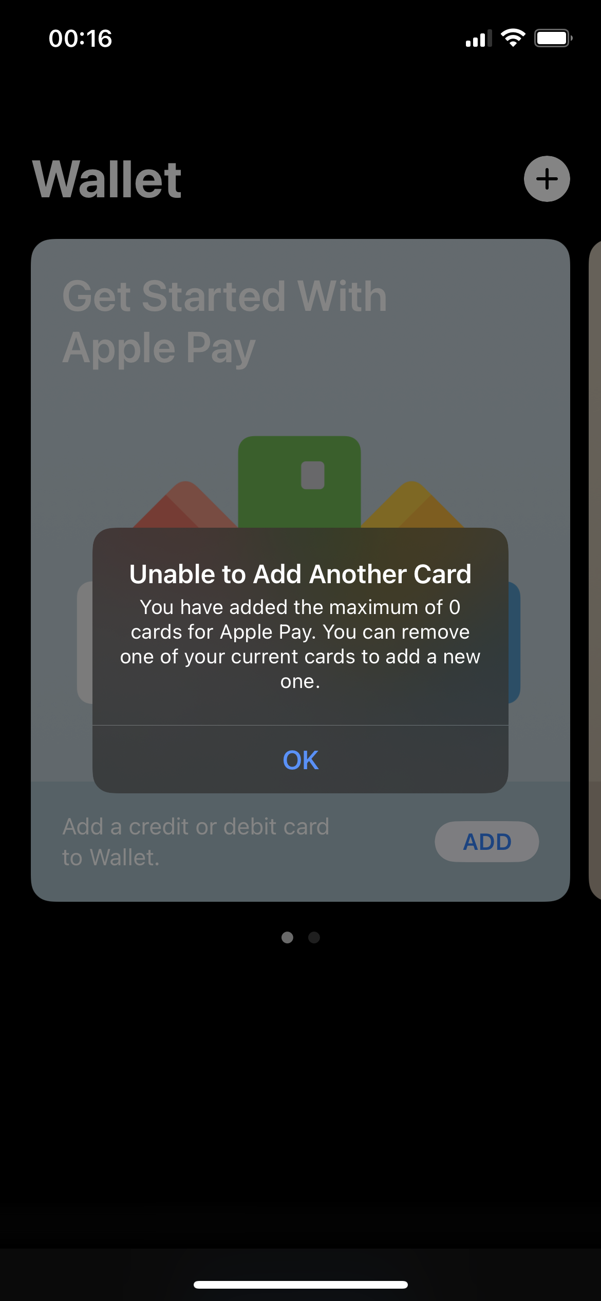 I have note that I have added 16 cards to walled and can’t add more, but there is no any card added. Was one, I have deleted it because suddenly it became unavailable. So now I can’t use Apple Pay