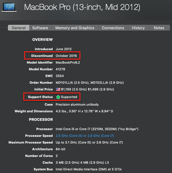 The MacBookPro 13-inch mid 2012 isn't list as vintage nor obsolete...