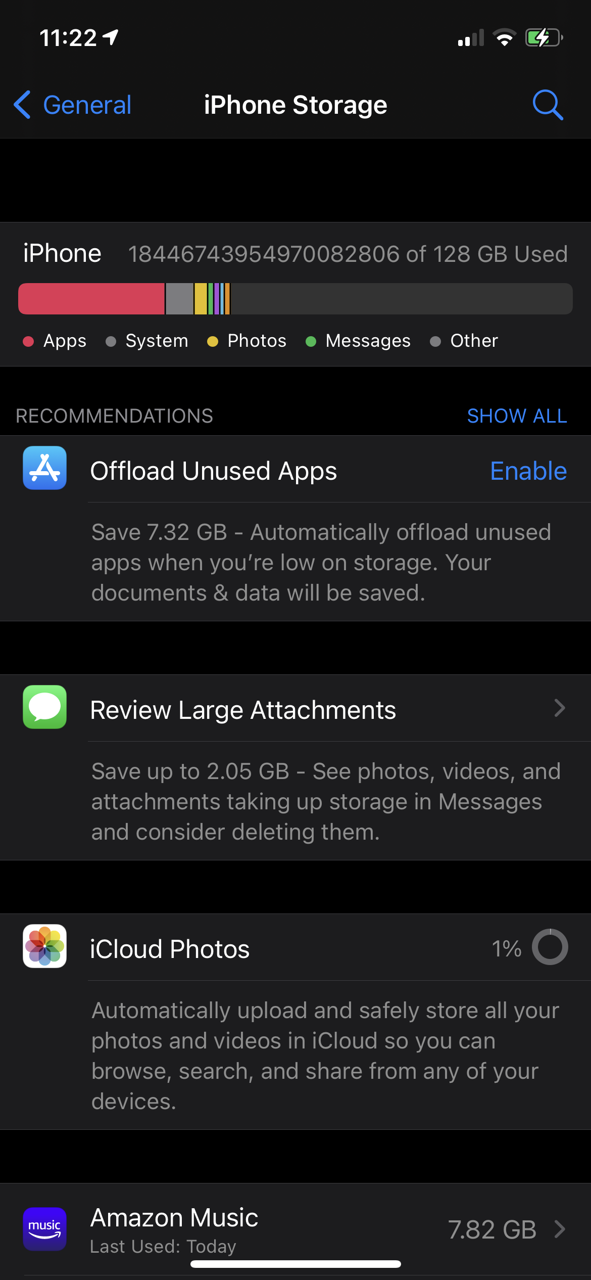 So I have a iPhone 12 pro and it only has 128GB but I love taking photos and playing games on it so I always take up a lot of space on it. I had just gotten a lightning cable USB drive to take off all my photos and save up some space. Now at first it was working great but my storage kept going down from 70GB to 45GB and then to 13GB. I was a bit worried but didn't think it was anything terribly bad cause the storage bars weren't down that much. Then a day ago I had seen the storage shoot to 18 quadrillion GB! I'm still able to download apps and take photos but it won't download the new software updates and I'm just wondering if anyone knows how to fix this.