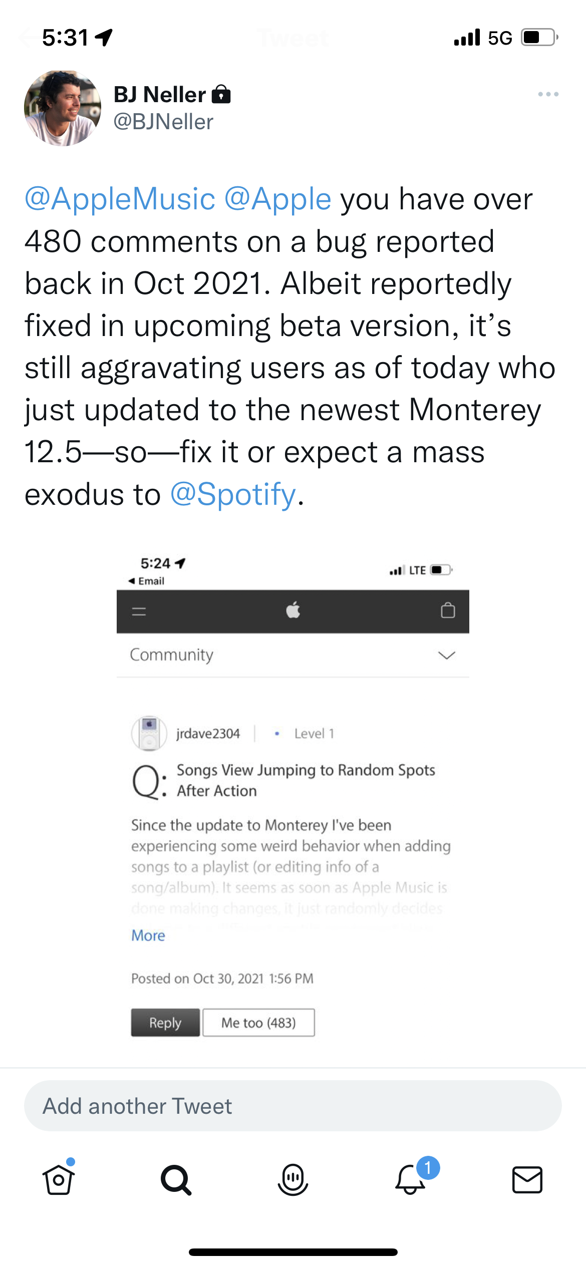 Since the update to Monterey I've been experiencing some weird behavior when adding songs to a playlist (or editing info of a song/album). It seems as soon as Apple Music is done making changes, it just randomly decides to jump to a different spot in my current view.