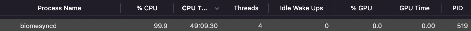 A process I don't recognize, and can't find any reference to on the web, 'biomesyncd' is constantly running at close to 100% CPU.