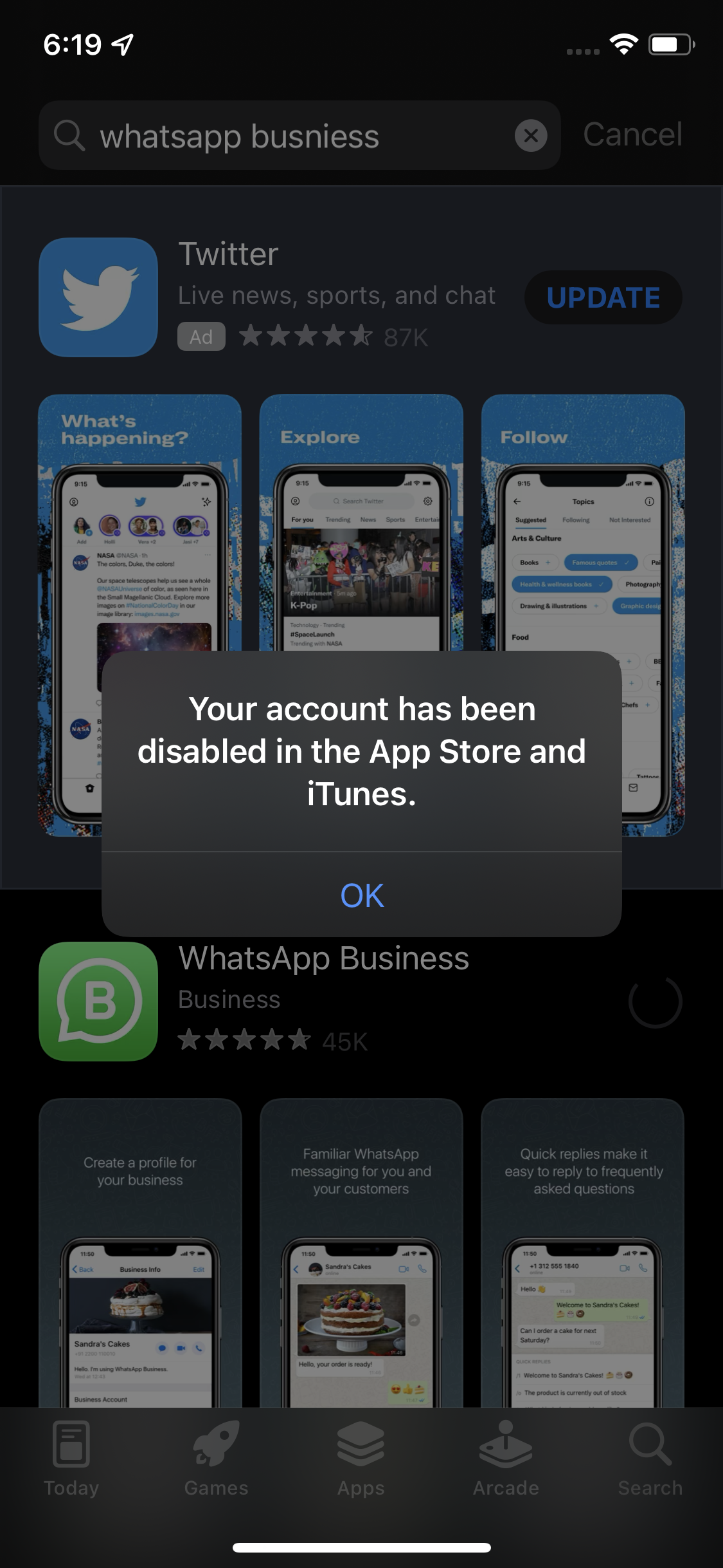 If you see a message that says 'Your account has been disabled in the App Store and iTunes'