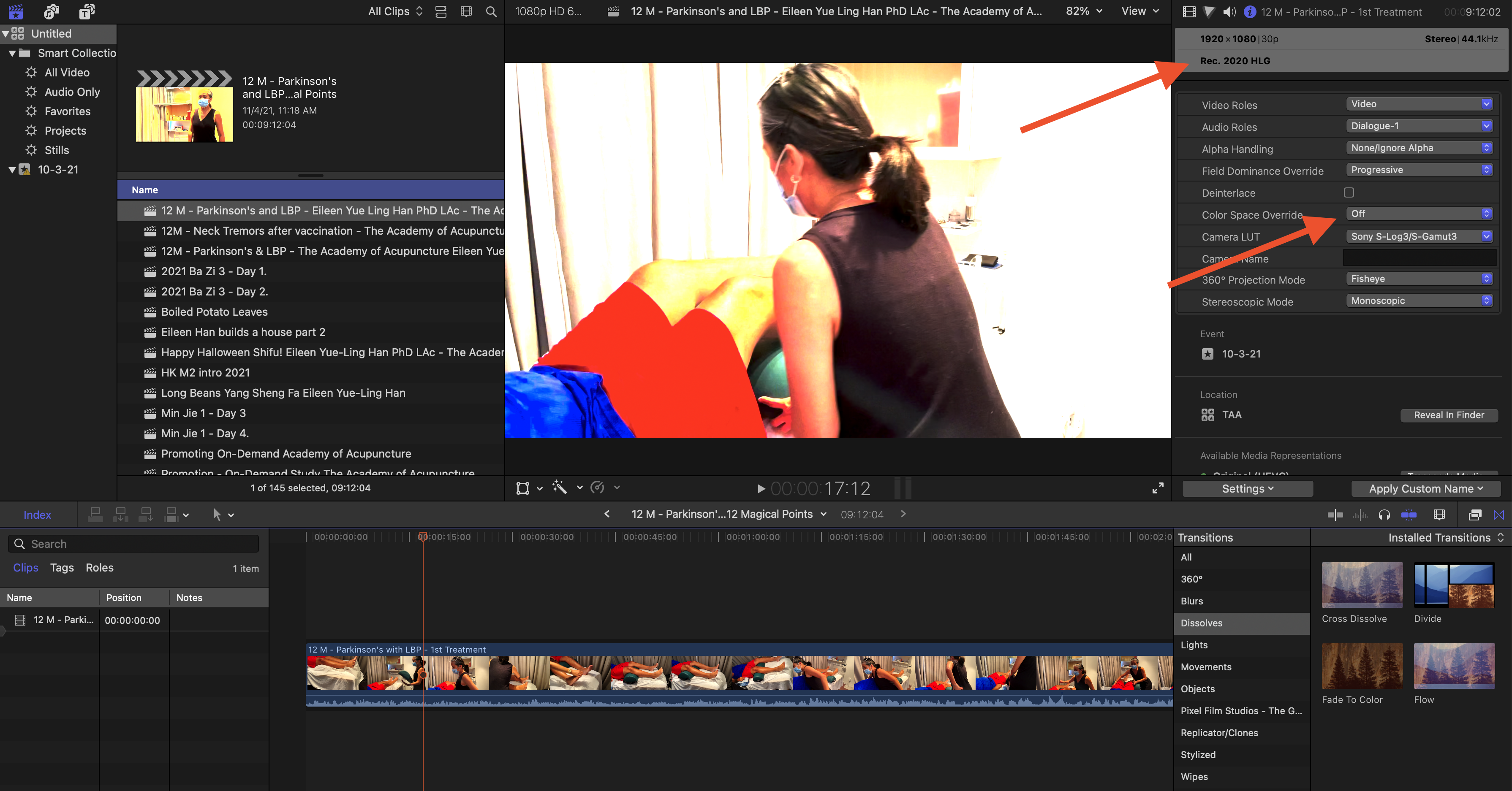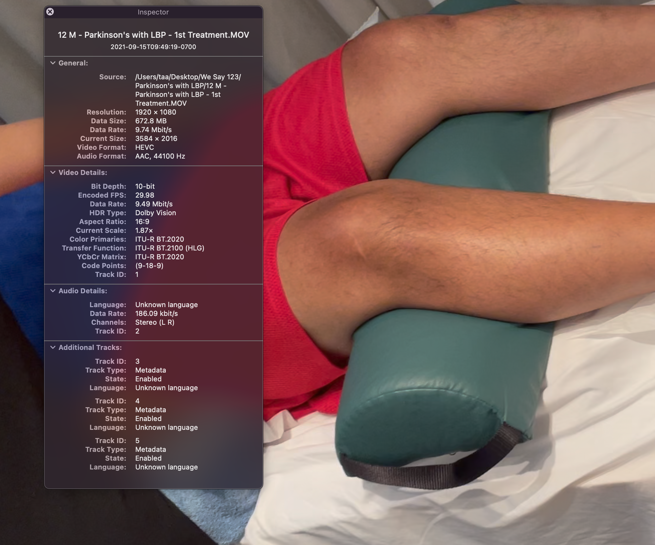 As a side-note, this clip I am having trouble with was recorded in the same room with the same lighting as another clip. Two patients were treated in the same room. I recorded one, pressed stop, recorded the other. Both video clips appear perfectly normal in QuickTime Player. One of the clips has no issues in Final Cut Pro. The other one is having this color problem in Final Cut Pro. No settings/lighting/camera/etc were altered. And again, the clip plays totally fine on QuickTime player.
